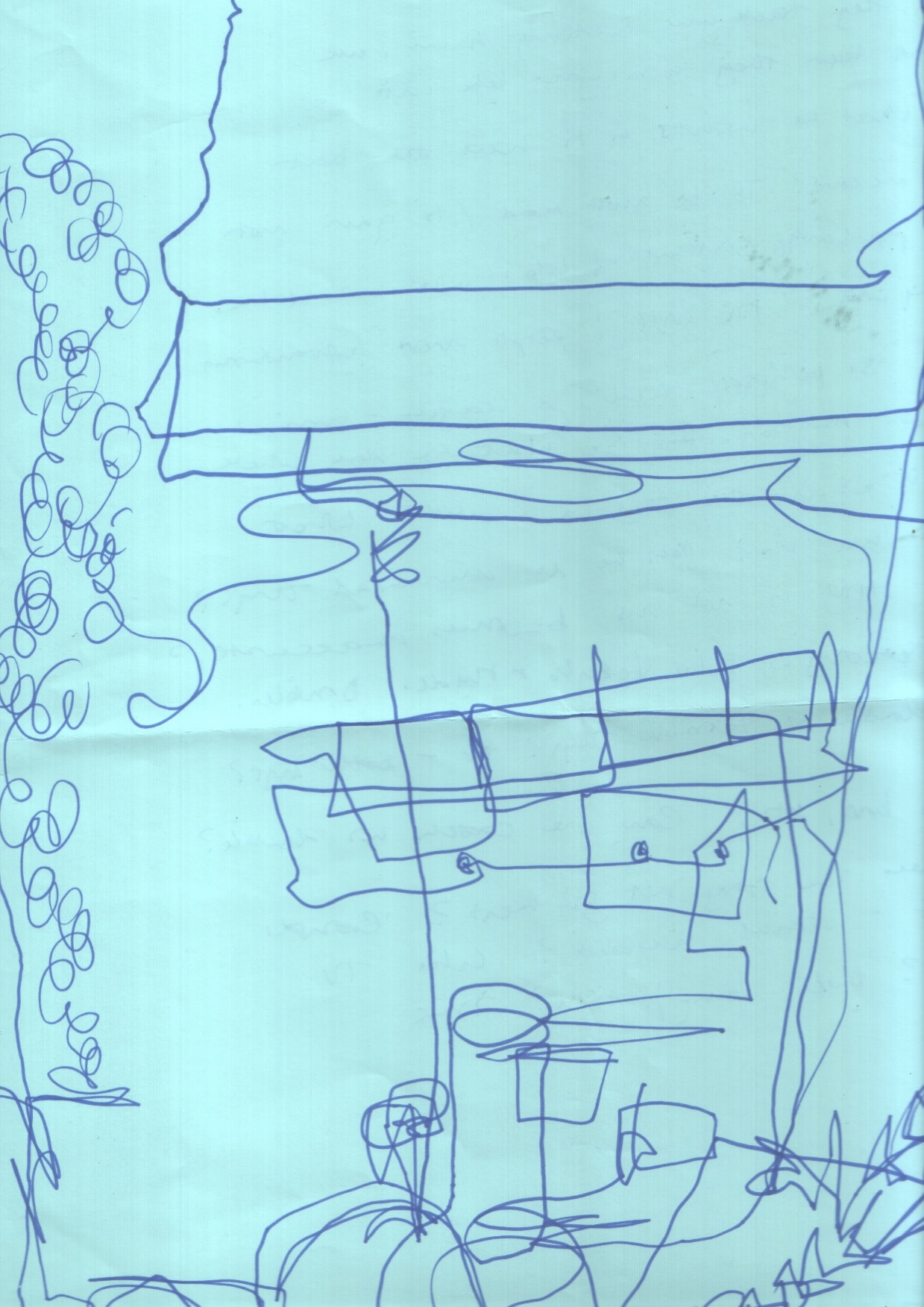 Philip and Patricia suggested this effect may be to do with a physical openness, a loosening up that transfers itself from the physical process of drawing to the more static, hunched-over business of writing. Perhaps it’s as simple as using movement to shake the ideas loose, in the same way that going for a walk can unstick you creatively. And I’m not sure how it would work with writers who haven’t drawn since school, who might well have negative preconceptions about their ability to draw ‘well’. But – even though I’m quite pleased with my blind mono – this isn’t about drawing well: what I learned was that you have to let go of the idea of making a good picture, to make good writing.